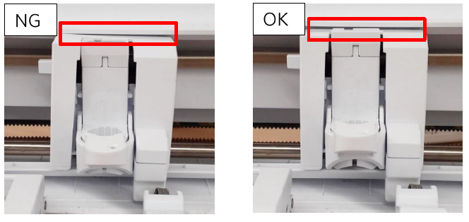 왼쪽과 같이 캐리지 덮개가 기울어져 있을 경우 문제가 발생할 수 있습니다.