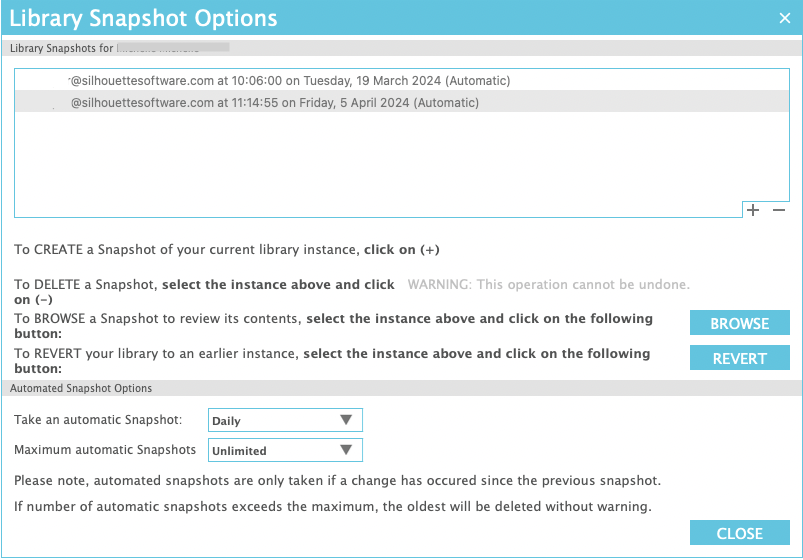 실루엣 스튜디오의 라이브러리 스냅샷은 디자인 라이브러리를 백업할 수 있는 유용한 기능입니다. 이 스냅샷은 라이브러리 디자인의 현재 상태와 구성 구조를 캡처하여 필요한 경우 복원할 수 있도록 지원합니다.