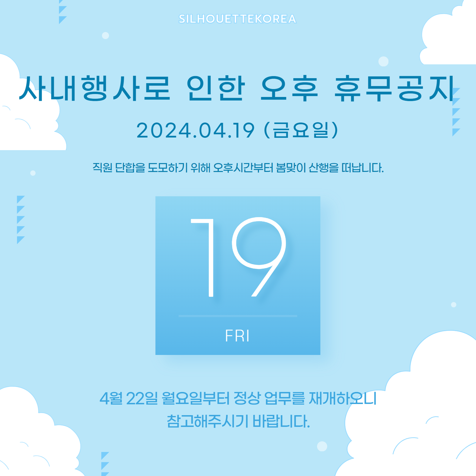 4월 19일 금요일, 봄맞이 오후산행으로 인한 휴무를 안내드립니다.